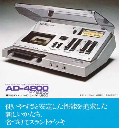 一般的には、本製品のように操作部が斜め上を向いているものは「スラント型デッキ」と呼ばれていた。(スラントは英語で「傾き」の意味。) 本製品の発売時期である1970年代の中頃というのは、それまで水平型(操作部が上面にあるタイプ)ばかりであったカセットデッキに、コンポ型(操作部が前面にあるタイプ=垂直型)製品がボツボツ現れた時期であった。 そういう過渡期ということもあって、水平、垂直どちらでもない「スラント型」の製品も少数派ではあるが存在し、本製品の他にAIWAのAD-4200やNakamichiの600などがあった。 |