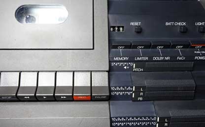 通常であれば、まず、使用テープに合わせてテープセレクタのスイッチを切り替えるのだが、ノーマルとクロム(ハイポジ)は自動切り替えになっているので操作不要である。 ただし、表示類は全く無いので正しく切り替わっているかどうかは機械を信じるしかない(笑)。 なお、フェリクロムテープは自動で切り替わらないため、使用する場合は「FeCr」のスイッチをONにする必要がある。 テープに合わせてバイアスを切り替えたり微調整することはできないため、ベストな録音をするためには相性の良いテープを選ぶ必要がある。 ちなみに、このデッキの推奨テープはBASFの「LH」と「chromdioxid」、SONYの「Duad」だったようである。 続いて録音の準備に入る。 操作キーで唯一オレンジ色に着色されている「REC」ボタンを押し込む。 左右メーターの間にある「RECORD」の赤いインジケーターが点灯する。 録音レベルが調整できるようになるため、メーターを見ながらスライドボリュームでレベル調整を行う。 本体もボリュームのスライダーも同じ黒色だが、目盛の表示がはっきりしているため、ボリュームの位置は分かりやすい。 しかし、板状のスライダーはツマミがなく、ギザギザの部分に指を押し当てて左右にスライドさせる方式なので、慣れないとちょっと操作がしにくい。特に微調整がやりにくい。 新品の状態ならボリュームが滑らかに動いて微調整も楽だったのかも知れないが、今や年代物の機械なので、ボリュームの滑りが悪くなっているせいかもしれない(笑)。 |