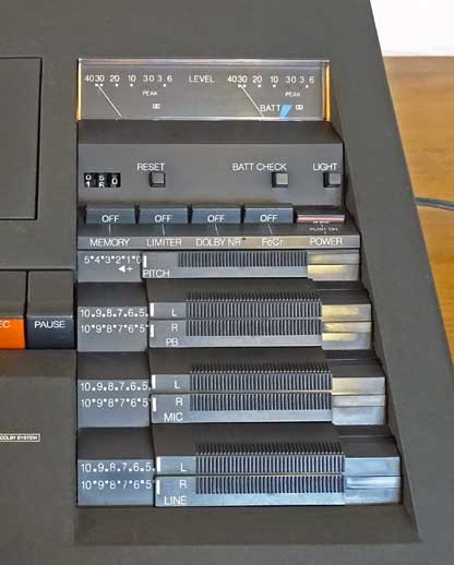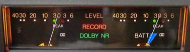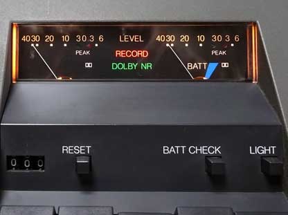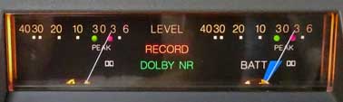 レベルメーターは左右一体型で、中心部に「LEVEL」「RECORD」「DOLBY」の表示ランプが付いている。「LEVEL」表示はメーター照明に連動して常時点灯している。 右のメーターには「BATT」の青い表示目盛がある。 本製品は交流電源だけではなく乾電池やカーバッテリーでも動作する3電源方式になっており、このメーターの目盛は電池の残量チェックのためのものである。 右メーターの下に小さな押しボタン「BATT CHECK」があり、これを押すと残量がチェックできる。 |