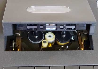 電源スイッチを押し込むと、左右のメーター照明が点灯する。 スイッチを入れた瞬間に内部で小さく「カタッ」とソレノイドが動作する音がする。少し間を置いて、再度音がする。 これは、タイマー録音のために押し込んだポーズボタンを、電源ON時に解除させるためのソレノイドが動作する音である。 カセットを入れるため、イジェクトボタンを押してリッドのドアを開ける。 イジェクトボタンは、横一列に並んだ操作キーの一番左にある。 ソフトイジェクトではないのでバタッとドアが開く。 ドアはカセットホルダにもなっているので、ドアの内側に沿ってカセットを装填する。本体がスラントしているため、カセットを下から上へスライドさせるような感じになる。 カセットを奥まで入れるとホールドされるので、その状態でドアを閉じる。 |
