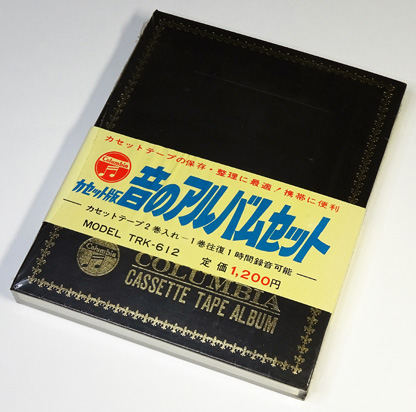 日本コロムビアの初期の製品で、2本のカセットをアルバム状のケースに収めてセットにした製品である。 ケースは厚紙製で、表面に枠取りのデザイン、「COLUMBIA」のロゴや製品名等が金色で箔押しされ、写真アルバムのような雰囲気である。 内部は、くり抜かれたクッション材の中にカセットを上下に2本はめ込むようになっている。 全体の大きさは、およそ (縦)167mm×(巾)137mm×(厚)15mm である。 製品バラエティとしては、収納されているカセットの録音時間がC-60タイプ「TRK-612」とC-90タイプ「TRK-902」があり、「TRK-612」の表紙の色はブラックとダークレッド(「TRK-612R」)の2種類、「TRK-902」はダークグリーンであった。 なお、収納されているカセットは、C-60タイプが「TRK-602」、C-90タイプが「TRK-901」という型番であった。 |