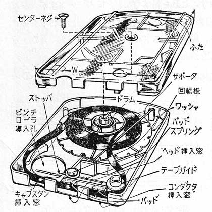 プレーヤー側に装備されたピンチローラーは、カートリッジ装着の邪魔にならないよう横倒しになっているが、カートリッジが押し込まれると「ピンチローラ導入孔」の部分で起き上がり、テープをキャプスタンに押しつける。 |