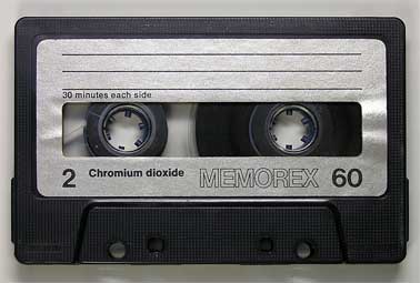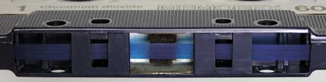 青いテープはリーダーテープである。 中心のヘッドブロックが収まる部分には、ヘッドを包み込むような「湯舟型5面磁気シールド」がはめ込まれており、写真では下部にも金属があるのが分かる。(通常のカセットのシールドは、ヘッドパッドの裏側のみ。) また、ヘッドパッドは他社のカセットに比べてかなり大きい。 |