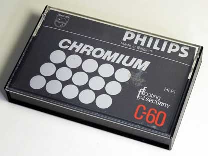 フィリップス社(本社:オランダ)のクロムカセットである。 フィリップスはカセットテープの規格を開発したメーカーで、日本でカセット機器を販売開始した1965年から1970年代中頃までは日本へもカセットテープの輸出・販売を行っていたものの、その後暫くの間日本国内での販売は行っていなかったが、1979年に各タイプの新製品を一斉に発売した。 本製品はいわゆるクロムポジション用のカセットであるが、磁性体に二酸化クロムが使われている本物のクロムテープである。 製造国はベルギーで、欧米向けの製品を輸入して販売したものと思われる。 本体内部のシールド板はハム対策のため凹型のものが使用され、また、スムーズで安定したテープ走行をさせるための「floating foil」という仕組みを内蔵している。 パッケージデザインは、黒のベース色にPHILIPSカセット伝統の水玉模様がシルバーでアレンジされている。 |