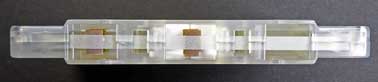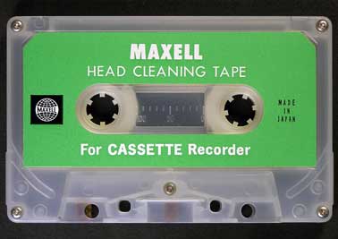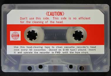 クリーニングテープは白い半透明のもので、後のカセットで標準装備となったクリーニング機能のあるリーダーテープに似ている。 2つある茶色のパッドのうち左がが消去ヘッド用で中央が録再ヘッド用。右にはパッドがない。(写真の上側が表面) |