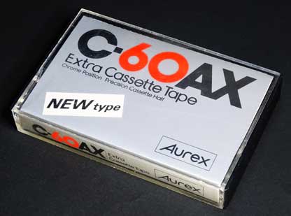 東芝が自社のオーディオブランドであった「Aurex」の名で発売したクロムポジション用のカセットである。 初期版「AX」のマイナーチェンジという位置付けのためか、パッケージのデザインは従来品のままで、「NEW type」の表示だけが追加されている。 しかし、カセット本体ラベルのデザインは大幅に変更されており、さらに、ノイズリダクションのチェック項目として「DOLBY」だけでなく、東芝独自の「adres」が追加されている。 本製品もTDK製のようで、本体ハーフの中央窓が大きくなっていることから、「SA(Improved)」のOEM版と思われる。 |