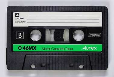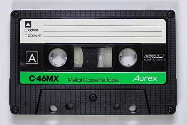 東芝オリジナルの「adres」と一般的な「DOLBY ® NR」が表示されている。 上のマークはA面を表す「A」を模式化したものではなく、録音防止爪の位置を示す上向きの三角印のようである。 |