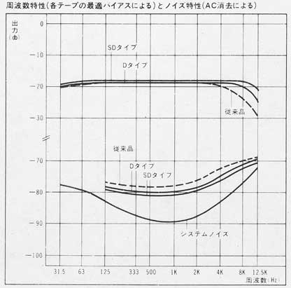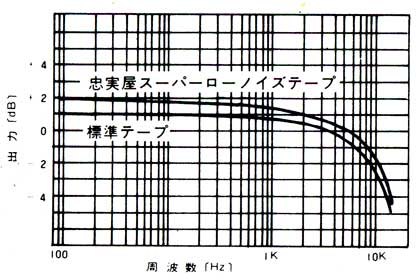 高性能テープでは、特性のカーブが直線に近いか右側(高音側)で上向きになっているのが普通だが、本製品は左側からすでに下がり始めており、さらに右側で急激に落ち込んでいる。 もっとも、縦軸の目盛りを見ると測定した録音レベルは±0dB〜+2dBのようなので、それだけの大入力に対しての特性としては良いとも言える。(通常、この手のグラフは、下の参考のように-20dB程度の小音量録音の特性が多い。) しかし、グラフの横軸の目盛がおかしい。1kの位置が正しいとすると、対数表示なので100と書かれている位置は10Hzで、100と1kの中間が100Hzのはずである。 まあ、こういうPBブランド品は性能より価格で選ばれることが多いので、このグラフもパッケージデザインの模様の一部ということかも知れない(笑)。 |