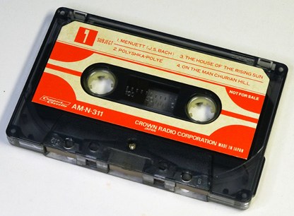 クラウン株式会社製のテープデッキ(または、ラジカセ)の付属品と思われるデモンストレーションカセットテープである。 同社は昭和20年代にラジオの製造販売を始め、昭和30年代からは「CROWN」ブランドでトランジスタラジオやラジカセなどの輸出販売を行っていた。主力は輸出向けだったが、国内での販売も行っており、ダイエーのプライベートブランド「BUBU」のラジカセの製造を行っていたこともある。 「CROWN」と言えば、スパイ映画に登場しそうなアタッシュケースに入ったラジオ付カセットレコーダーが思い起こされるように、同ブランドのカセット機器はラジカセやテレコがほとんどであったが、1970年代にはオーソドックスなタイプのカセットデッキも販売していた。 本製品はそれらの機器の付属品のようで、A面には試聴用の音楽が録音されており、B面はブランクとなっている。 |