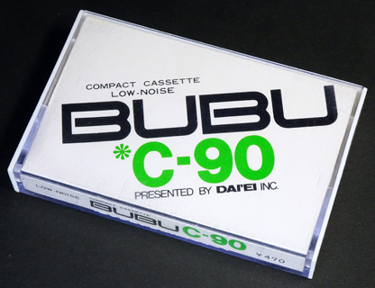 ダイエーが「BUBU」という当時のプライベートブランドで販売していたLNタイプのカセットである。 「BUBU」は当時のダイエーが主に家電商品に使っていたブランドで、メーカー品に較べて安価な価格設定がされていた。 本製品の470円という価格は、当時の各メーカーのLNタイプC-90が600〜650円だったのに較べると2〜3割程度安い設定であるが、同じBUBUの上位グレードである「LOW-NOISE HIGH-OUTPUT」とは60円しか違わないため、お得感がやや薄い印象ではある。 パッケージやカセット本体の意匠は「LOW-NOISE HIGH-OUTPUT」とほぼ同じだが、パッケージのベース色が白なので、よりシンプルな印象になっている。また、プラケースも白色の素材のものが使われている。 「LOW-NOISE HIGH-OUTPUT」も同様だが、BUBUのカセットは、パッケージに大きく「C-90」と書かれてる文字はグリーンのカラー印刷となっているにもかかわらず、カセット本体ラベルはオレンジ色で印刷されているため、使っているとちぐはぐな感じを受ける。 製造元は定かでないが、パッケージ裏面に「MADE IN JAPAN」の表示があり、カセット本体ハーフの色は富士フイルムの「FL」に似ている。 |