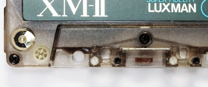左上のA、B面の表示はカセットハーフそのものに成形されており、その部分だけメタリックのインデックスラベルが丸く切り取られている。 |