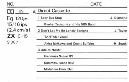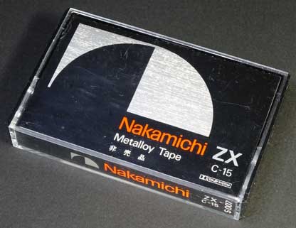 ナカミチの試聴用デモンストレーションメタルテープである。 A面に音楽、B面はブランクという通常のデモテープの形式であるが、A面の音楽はカセット規格の1/2のスピード(約2.4p/s)で録音されているという特殊なテープである。 これは、ハーフスピードでの録再もできる同社のカセットデッキ「680(ZX)」の附属品として製作されたもので、説明によると、ミュージックテープ製造機でプリントしたものではなく、マスターテープの音源を個々の製品で録音して附属品にしていたらしく、かなりマニアックなものである。 ベースのテープはメタルタイプの「ZX」を使っているものの、スピードが半分になるとさすがに高域特性は厳しくなるようで、イコライザ設定はメタルやハイポジ用の70μsではなく、ノーマルテープ用の120μsが使われている。 「680」はハーフスピードでもFM放送のエアチェックには充分な10〜15kHzの周波数特性(ZXテープ使用時)でワウフラ0.08%以下を確保しており、このデモテープも半速とは思えない堂々とした音で再生させる。 |
