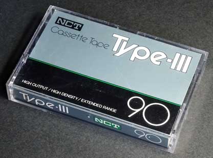 秋葉原にあったテープ専門店「エフ商会」のショップブランドである「NCT」のスーパーLHタイプのカセットである。 製品名は「TypeV」だが、IEC規格の「TypeV」(フェリクロムテープ)のカセットではなく、パッケージ裏面に「テープ・セレクタ:ノーマル・ポジション」と記載されているとおり、TypeTのテープである。 製品名に付けられた「V」の意味は「TやUよりも上級のグレード」であることを表しているものと思われる。 供給元は不明であるが、専門店ブランドの上級機種だけあって、カセット本体の作りはしっかりしており、音質もくせのない安定したものであった。 |