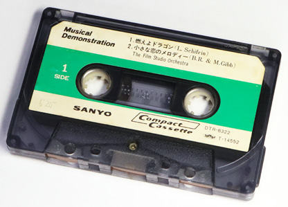 「三洋電機」のデモンストレーション用カセットである。 A、B面ともに2曲ずつ演奏物の音楽が録音されている。 テレコ等の付属品のデモテープの場合は、A面のみ録音がされていてB面は録音可能なブランクとなっているものが多いが、両面に音楽が録音されている本品は、店頭での販促用の試聴用デモテープかもしれない。 録音可能時間を表す「C-XX」の表示がないことも、録音用途として使うことを前提にしていないように見受けられる。 |