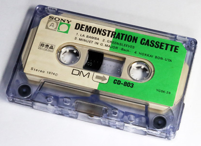 | コメント: | ソニーのカセットテープレコーダーの付属品であったデモテープである。 A面には様々なジャンルの楽曲がインストゥルメンタルで4曲録音されており、B面はブランクとなっている。 |