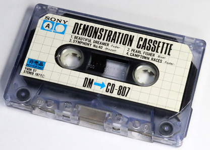 | コメント: | ソニーのカセットテープレコーダーの付属品であったデモテープである。 A面にはポップス系のインストゥルメンタル曲やクラシックをジャズ調にアレンジした曲など4曲がステレオで収められており、B面はブランクとなっている。 |